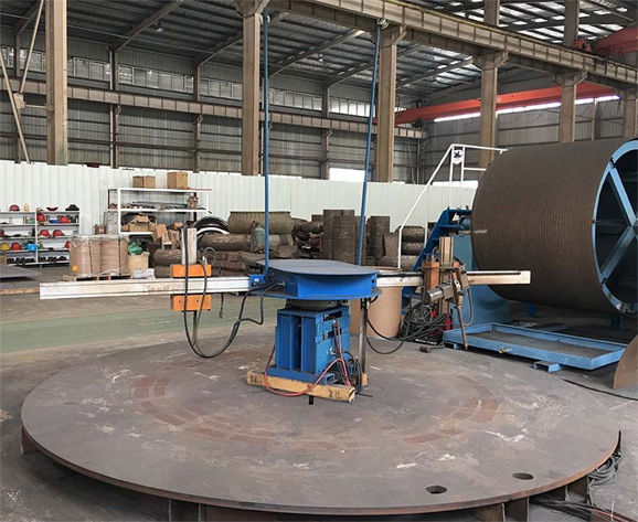 4、使用特种耐磨焊丝进行明弧自动焊,堆焊缓冲层和耐磨层,厚度12mm,表面花纹为一字纹或者菱形加点纹(客户选择)。保证外圆直径达到图纸要求。